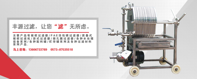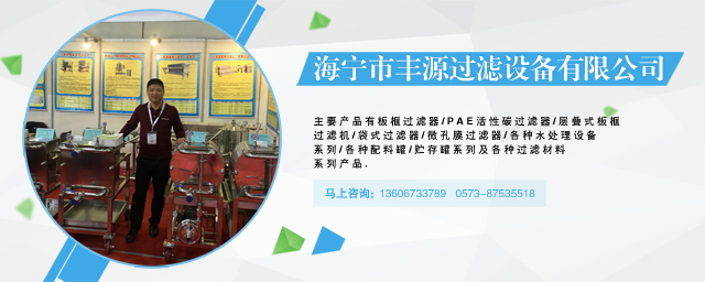 海宁市丰源过滤设备有限公司是一家专业生产各种医药、生物、电子、化工、食品、环保、发电、纺织等行业的过滤、水处理、配料设备的公司。产品有各种不锈钢过滤机系列,各种水处理设备系列,各种配料罐、贮存罐系列及各种过滤材料系列产品,近几十种产品、上百种规格,小到实验室的试验和中试设备,大到规模化生产设备。